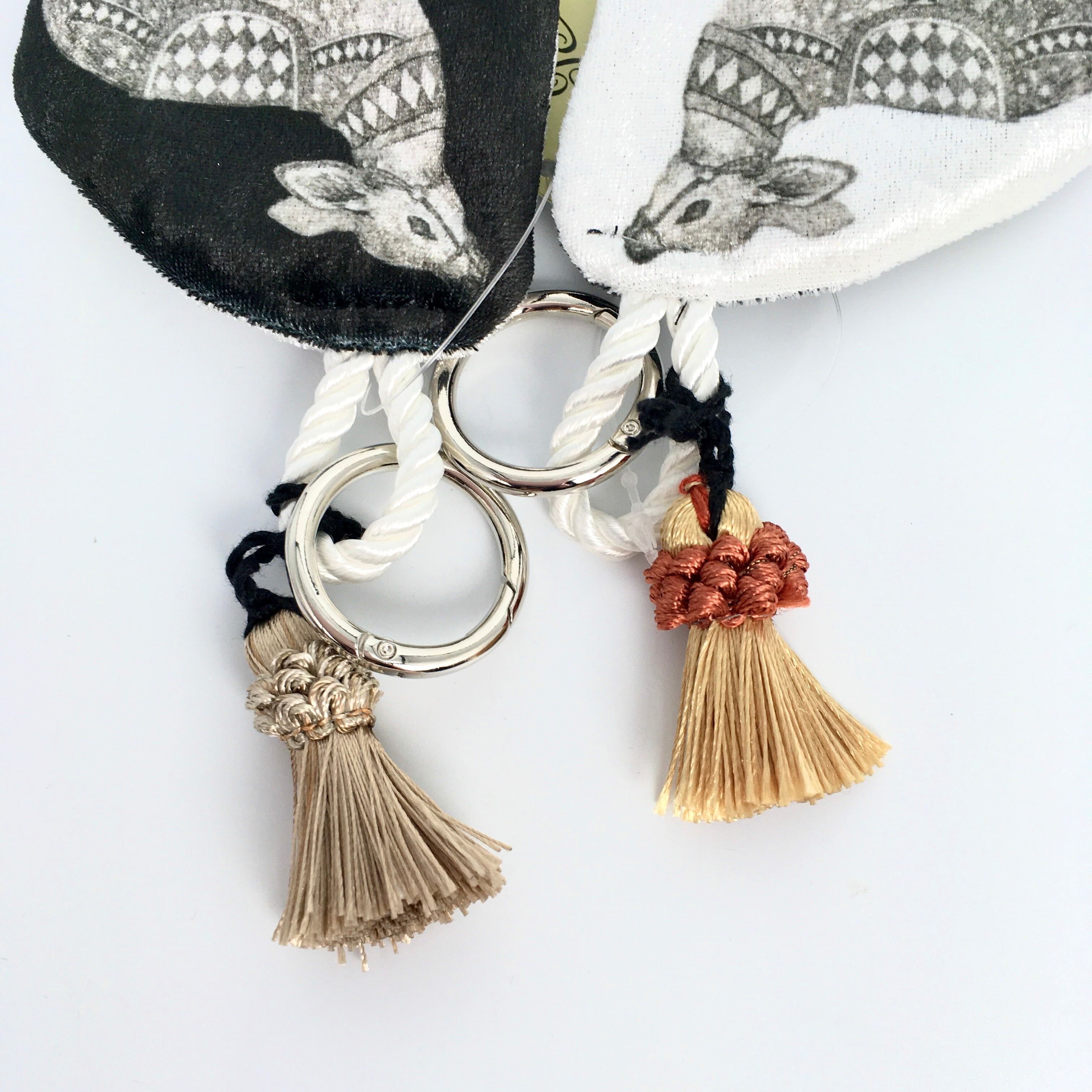 小さなタッセル付きの布地のバッグチャームです。