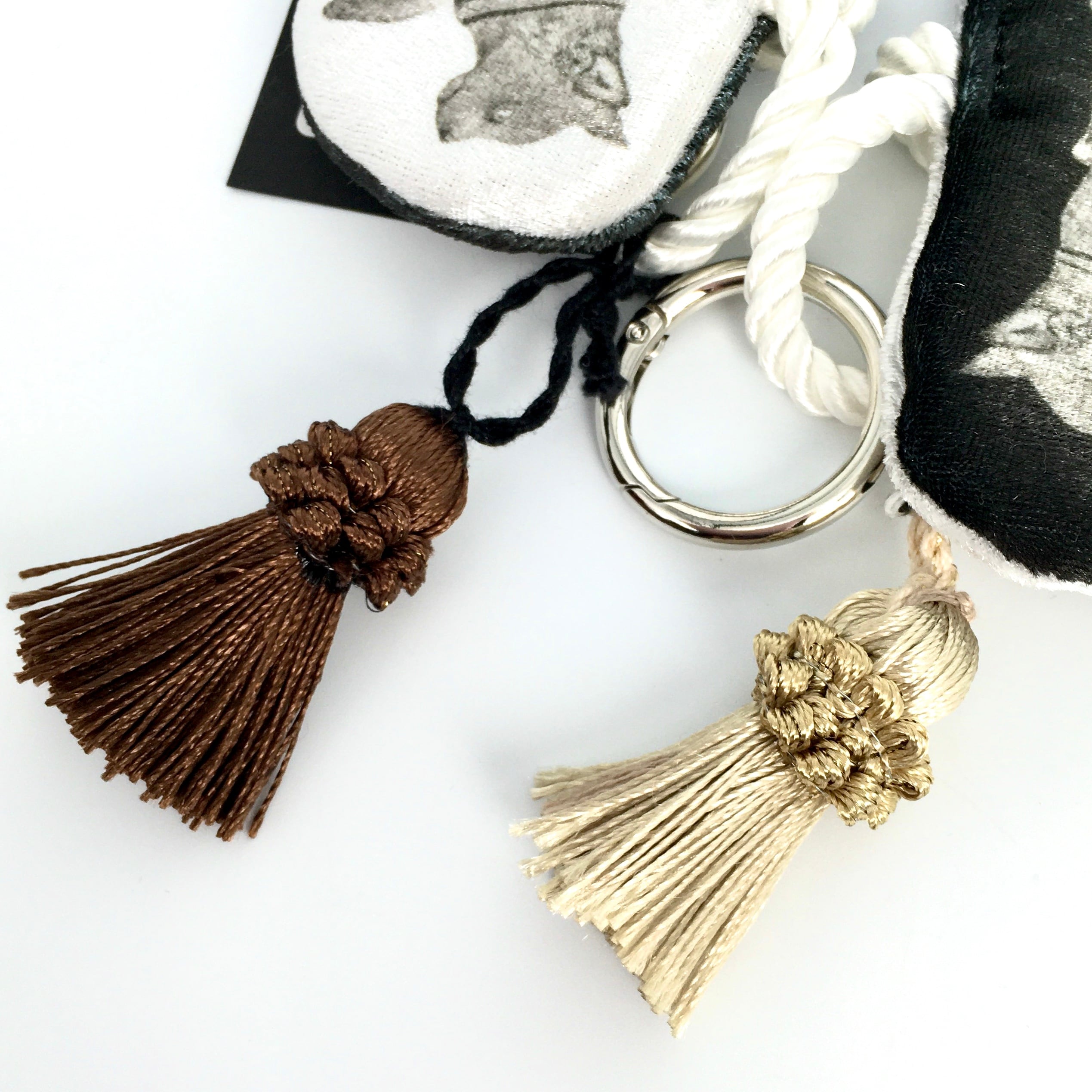 小さなタッセル付きの布地のバッグチャームです。