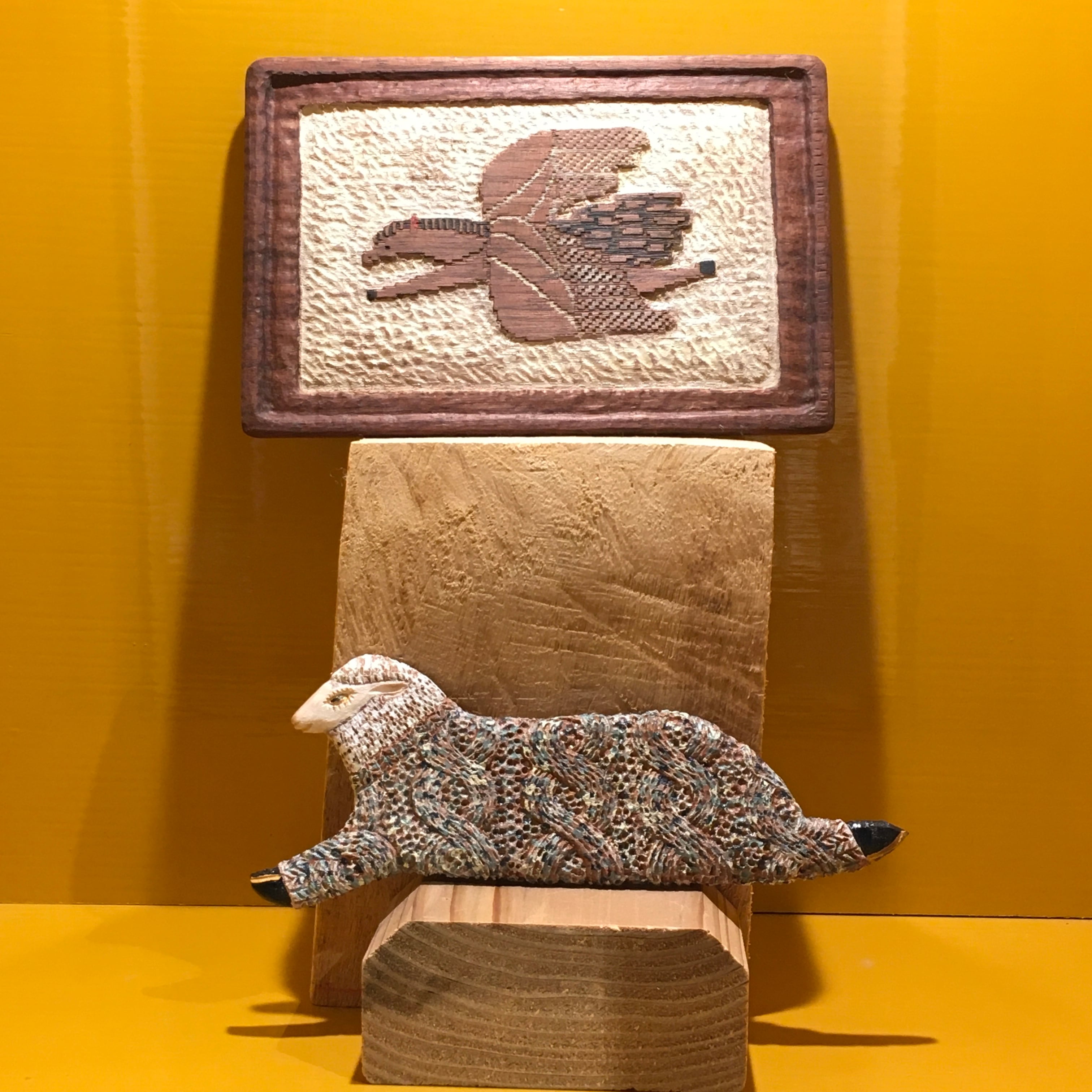 ひとつひとつ作家が木彫りした、後ろの出っ張りや紐で壁に掛けられる作品です。