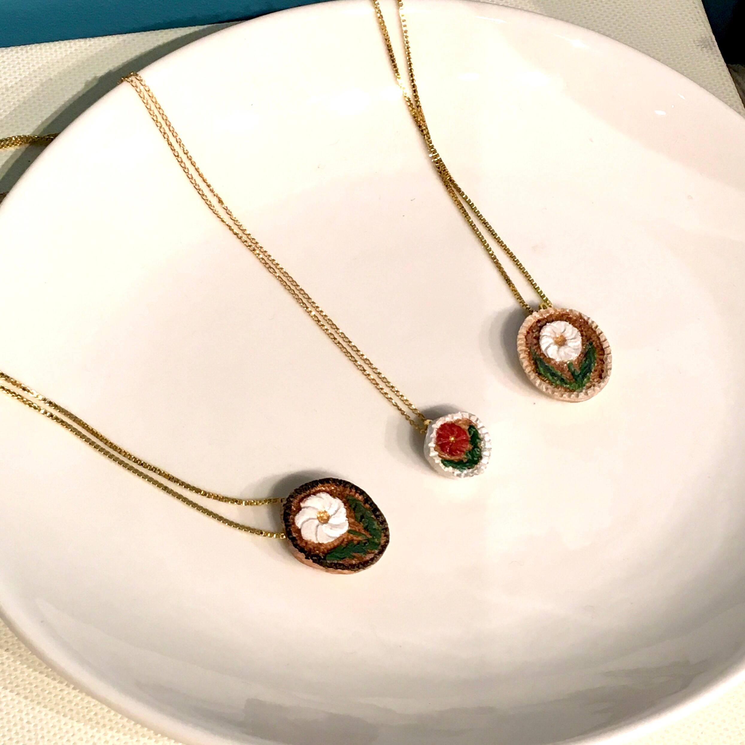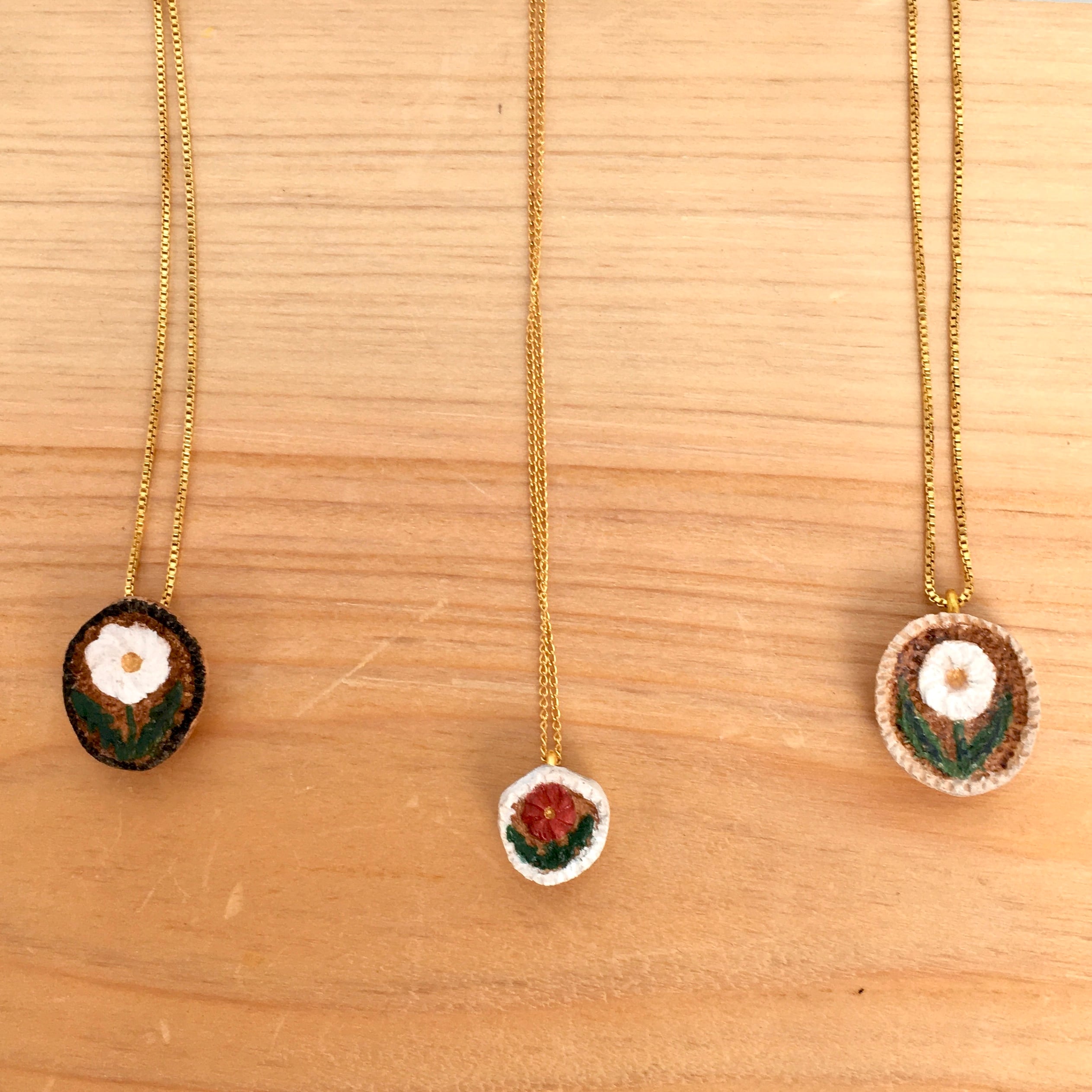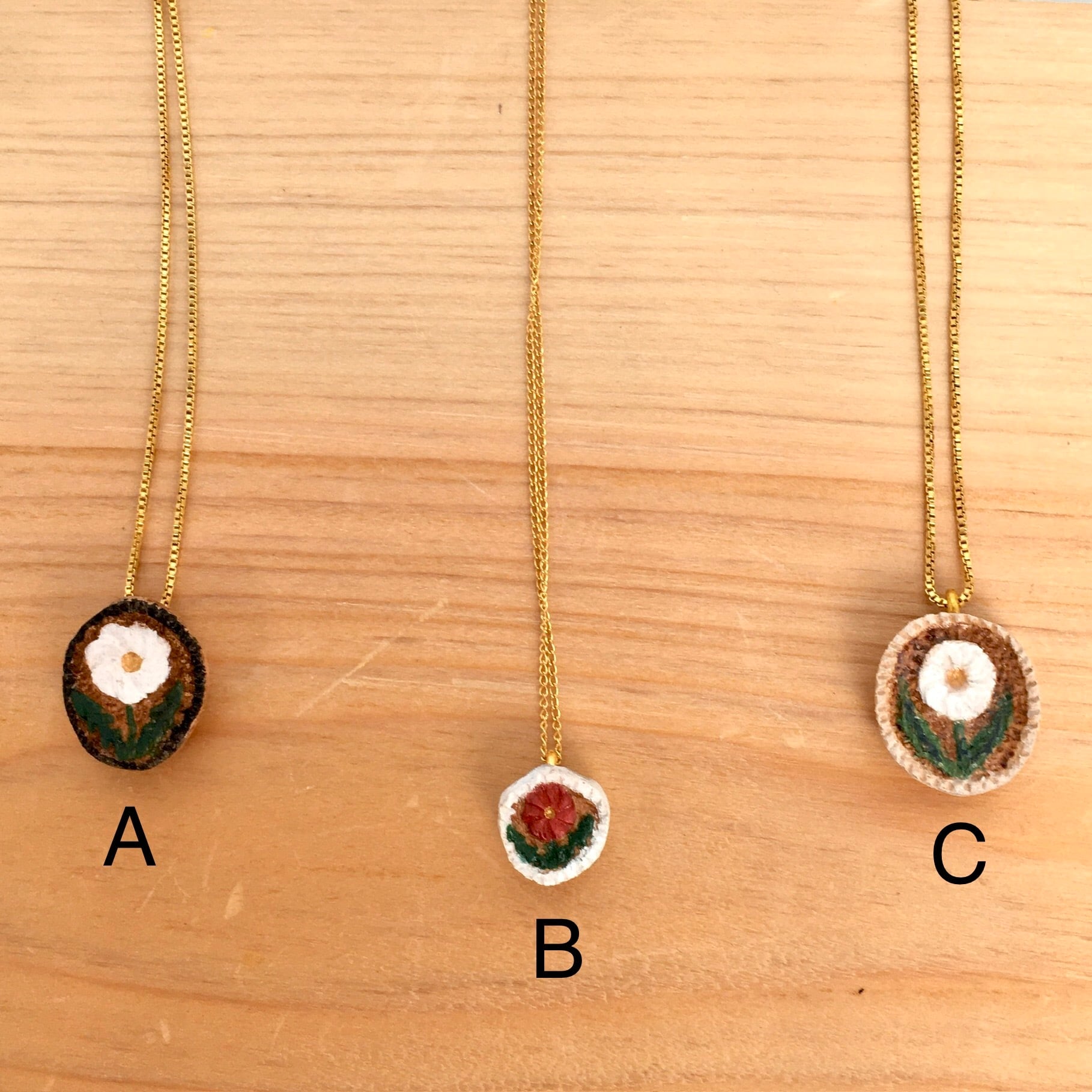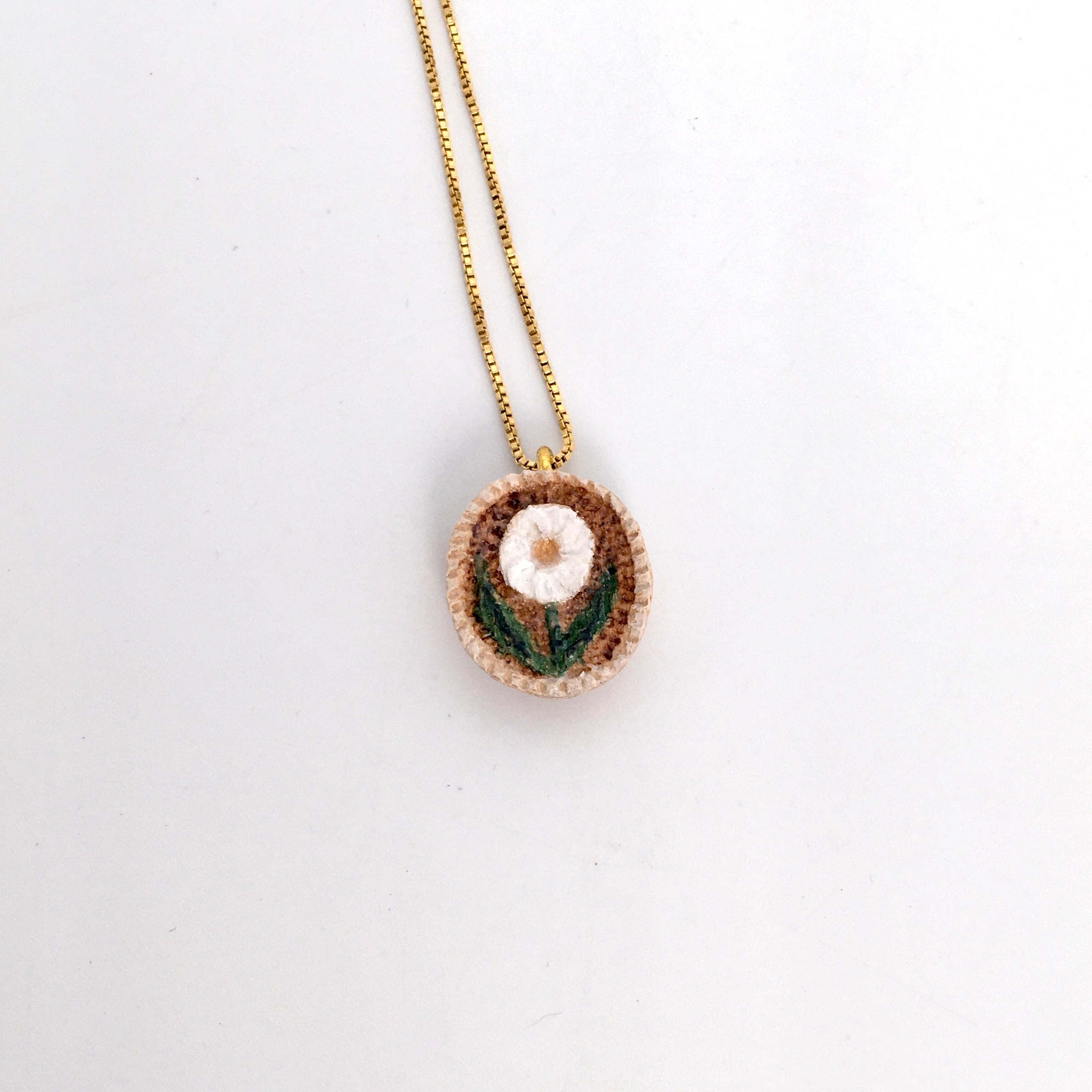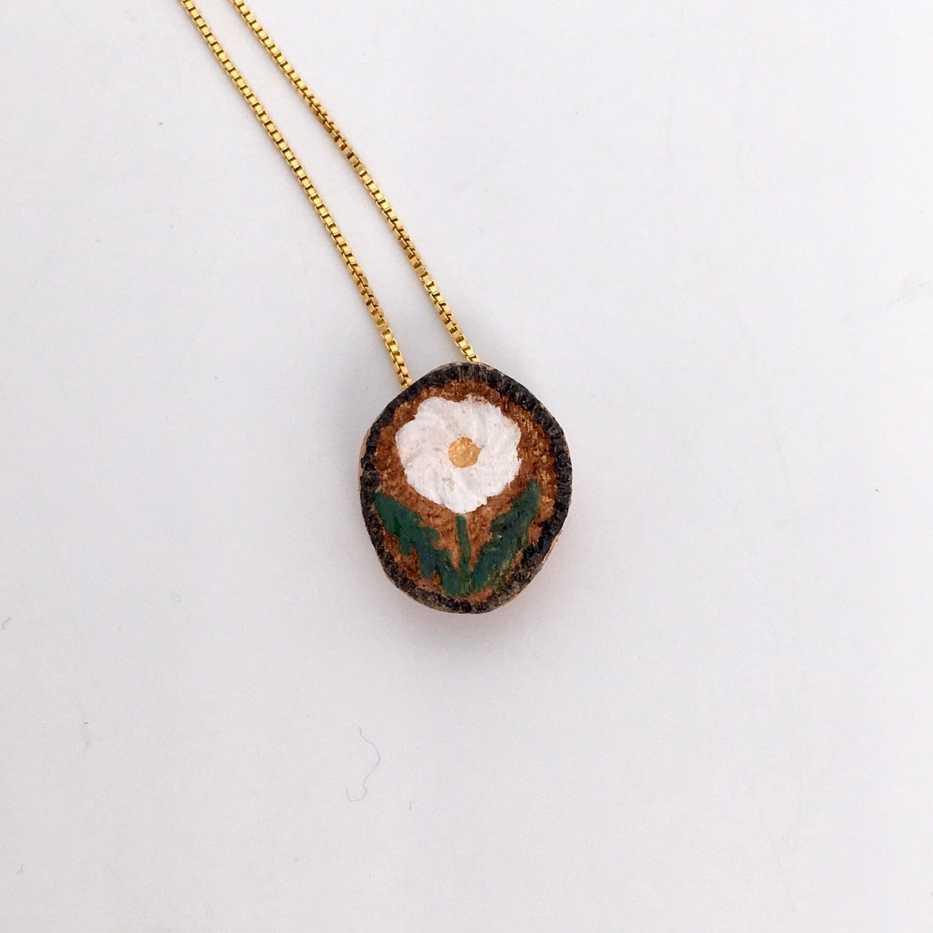 コロンと木彫りの花が揺れるネックレスです。