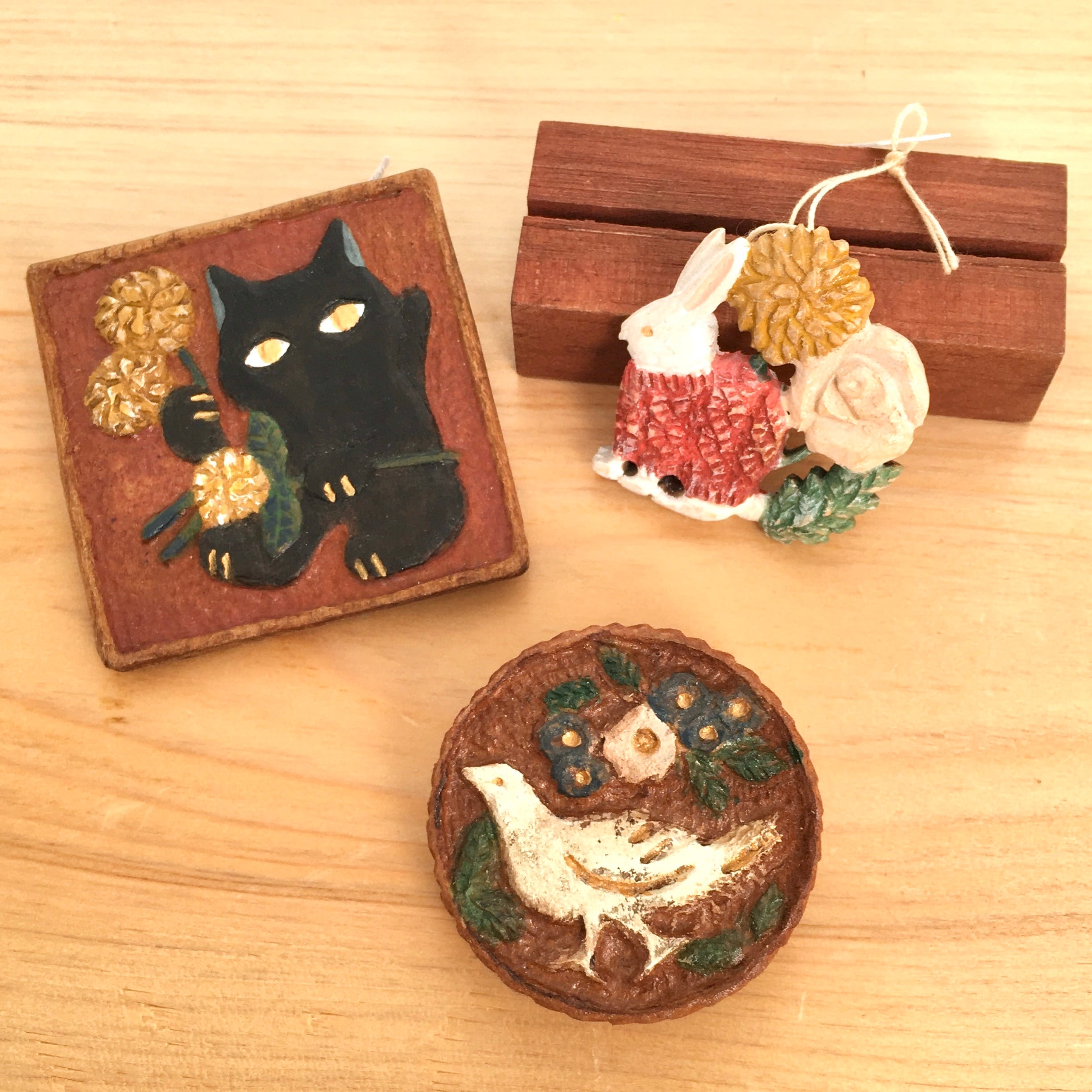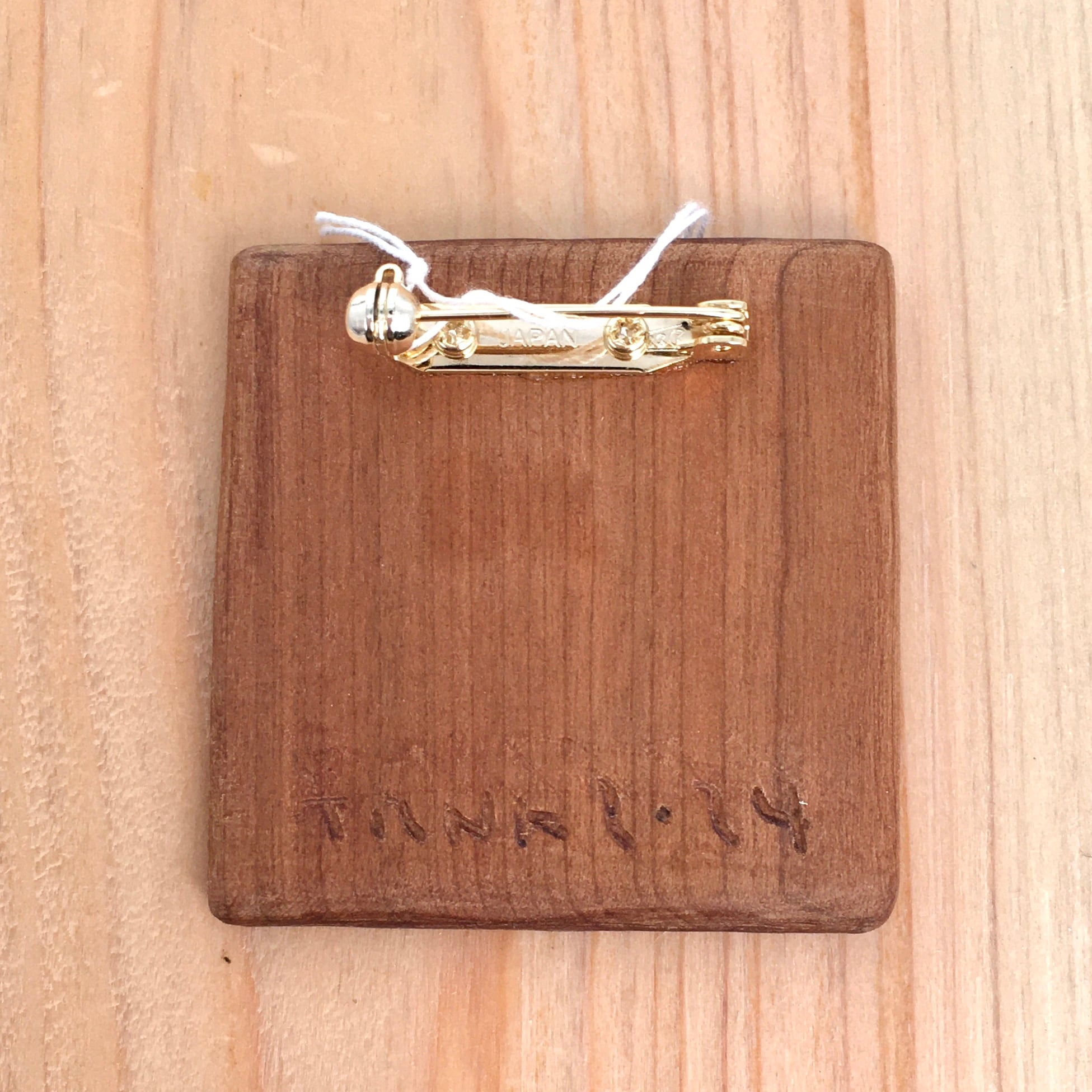木、バターミルクペイント、ブローチ金具