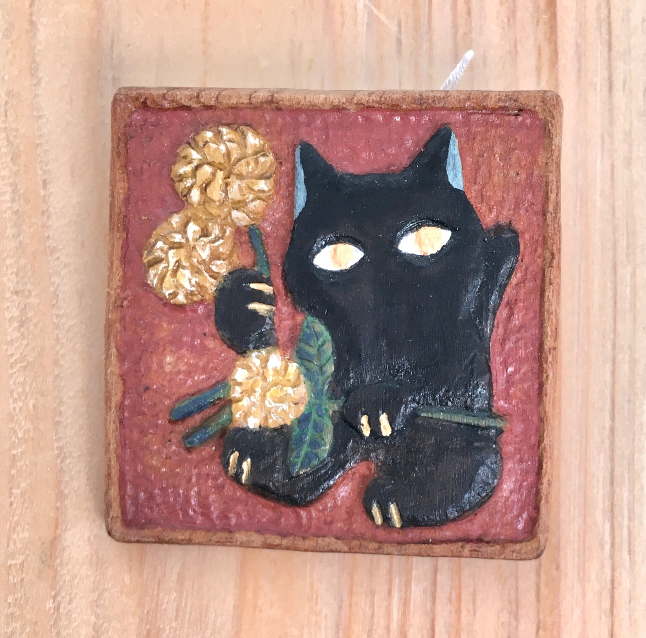 【トリノコ】木のブローチ「花を摘む猫」