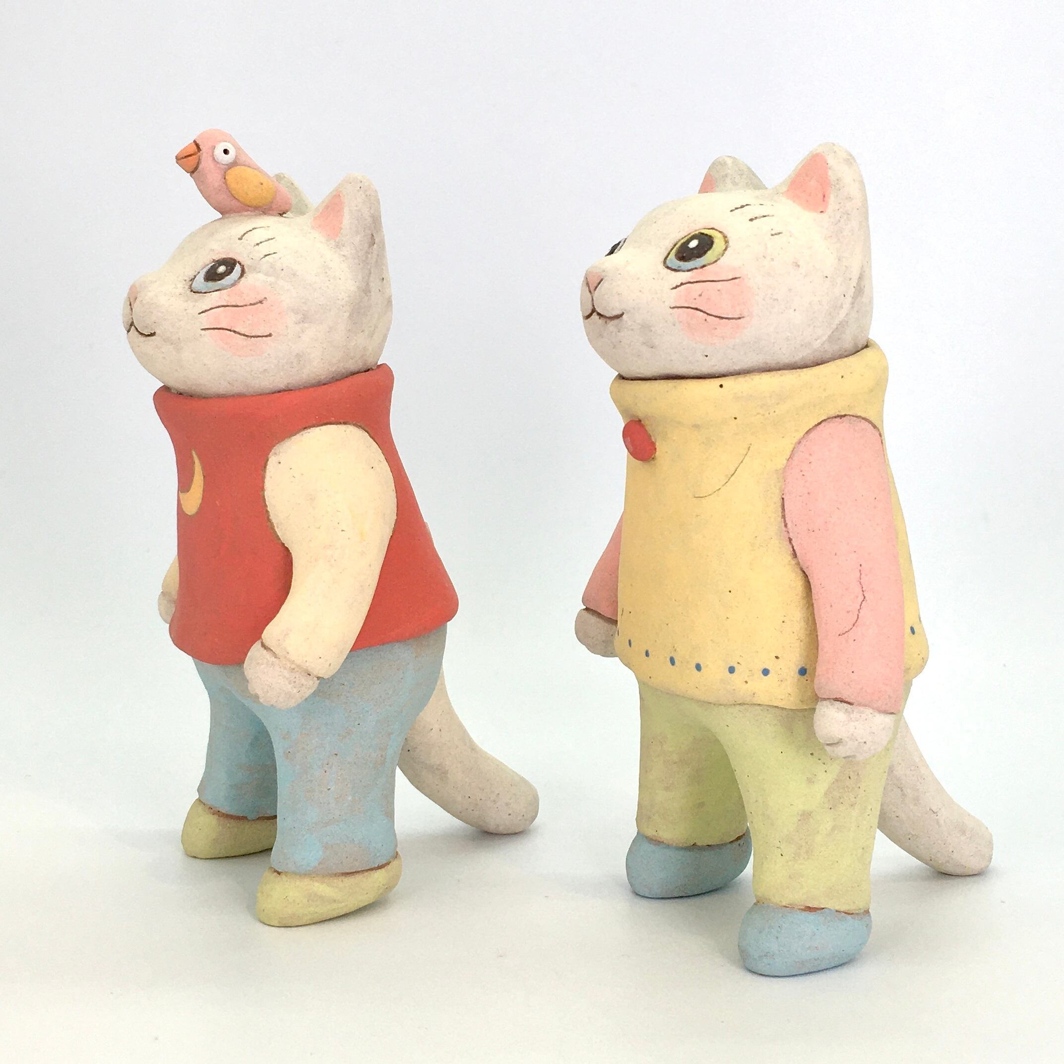 黄色いお洋服のネコを先最初に置いてから、赤いお洋服のネコを置いてあげてください)