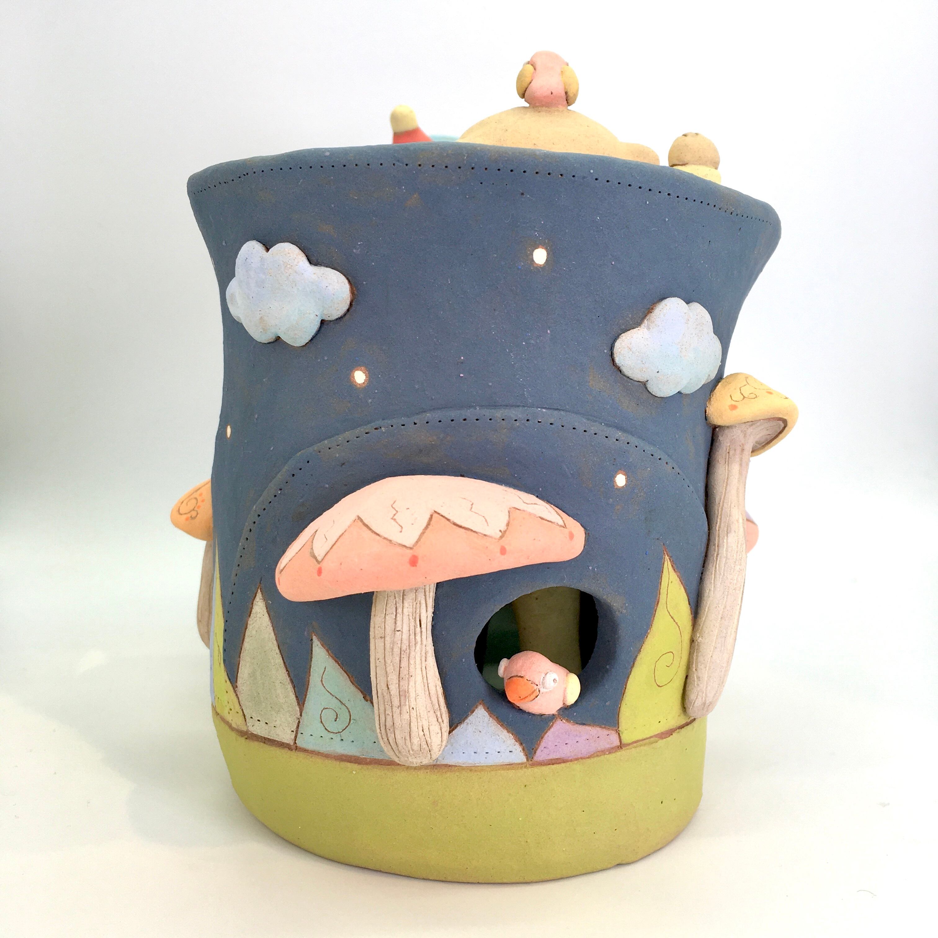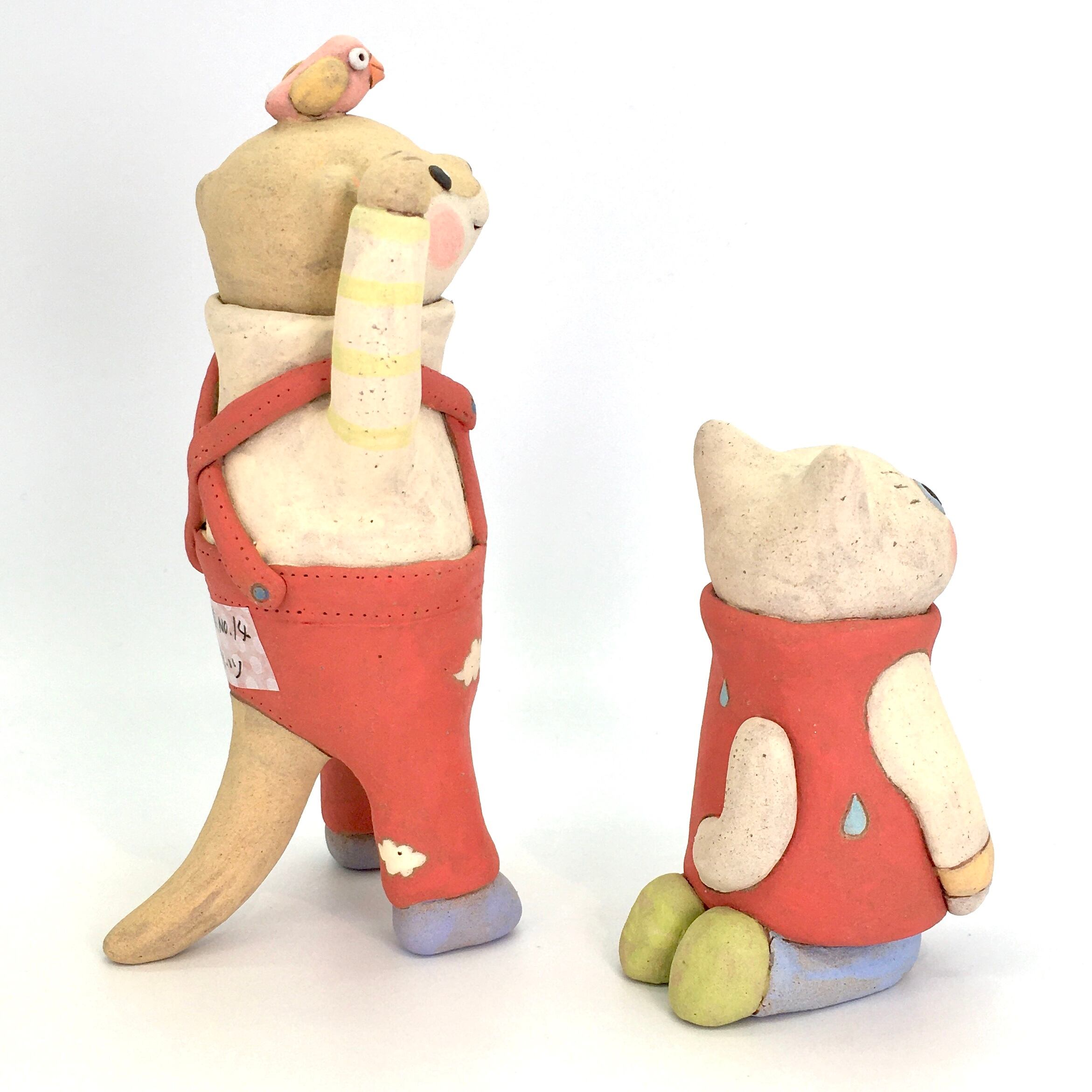 丸窓からネコの人形、履き口からカワウソの人形が顔を覗かせる陶芸作品です。