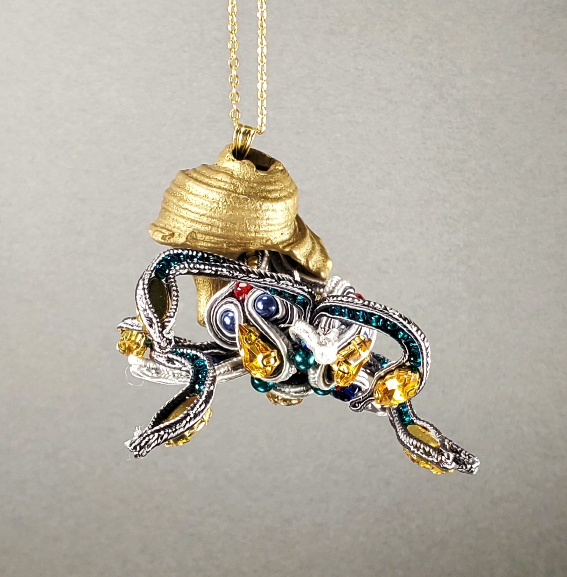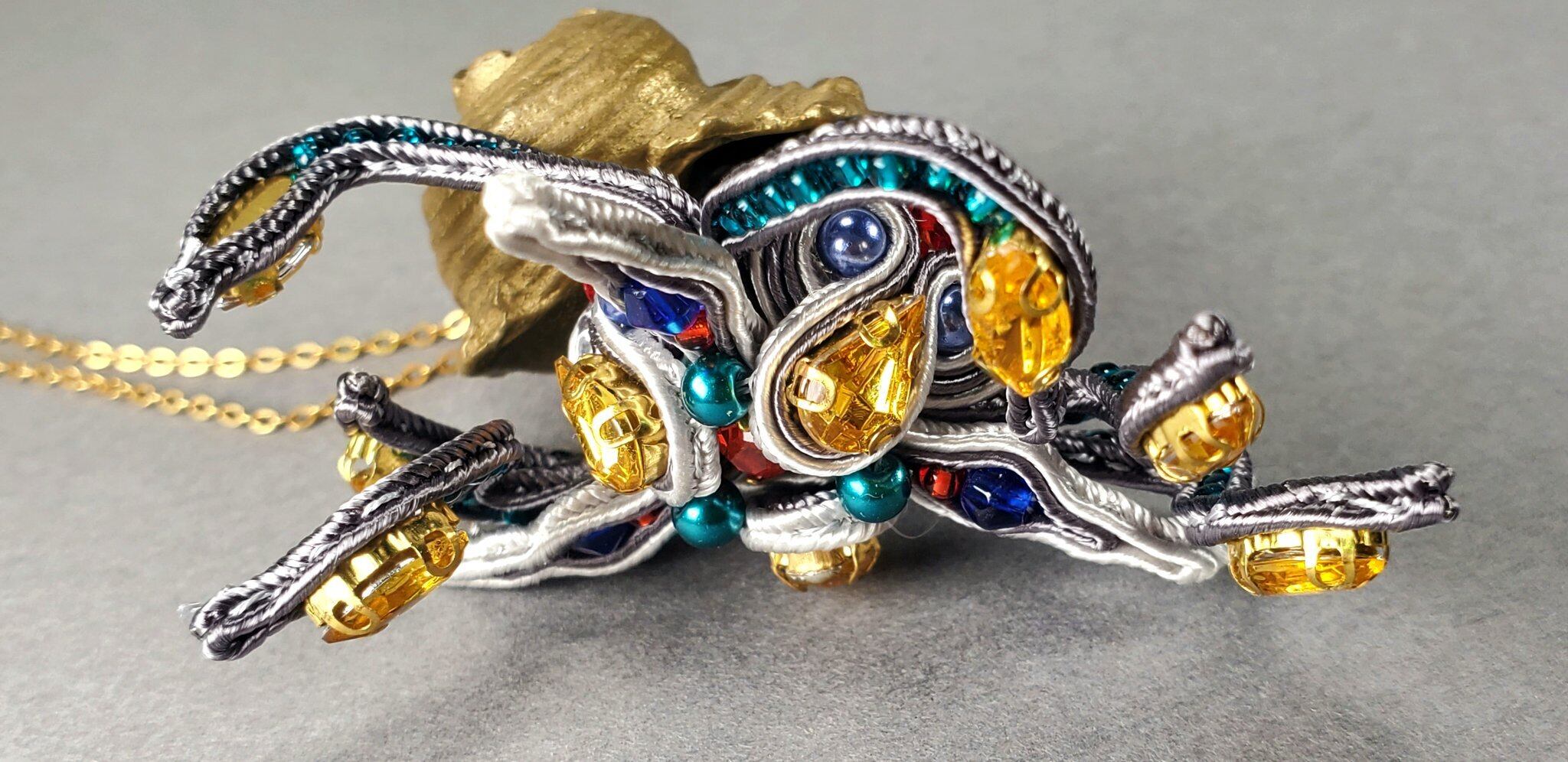 欧州伝統技法『ブレード刺繍』を用いて制作。アオイガイのような、POPで可愛らしい作品。殻は真鍮のコシダカサザエ。1点のみ!