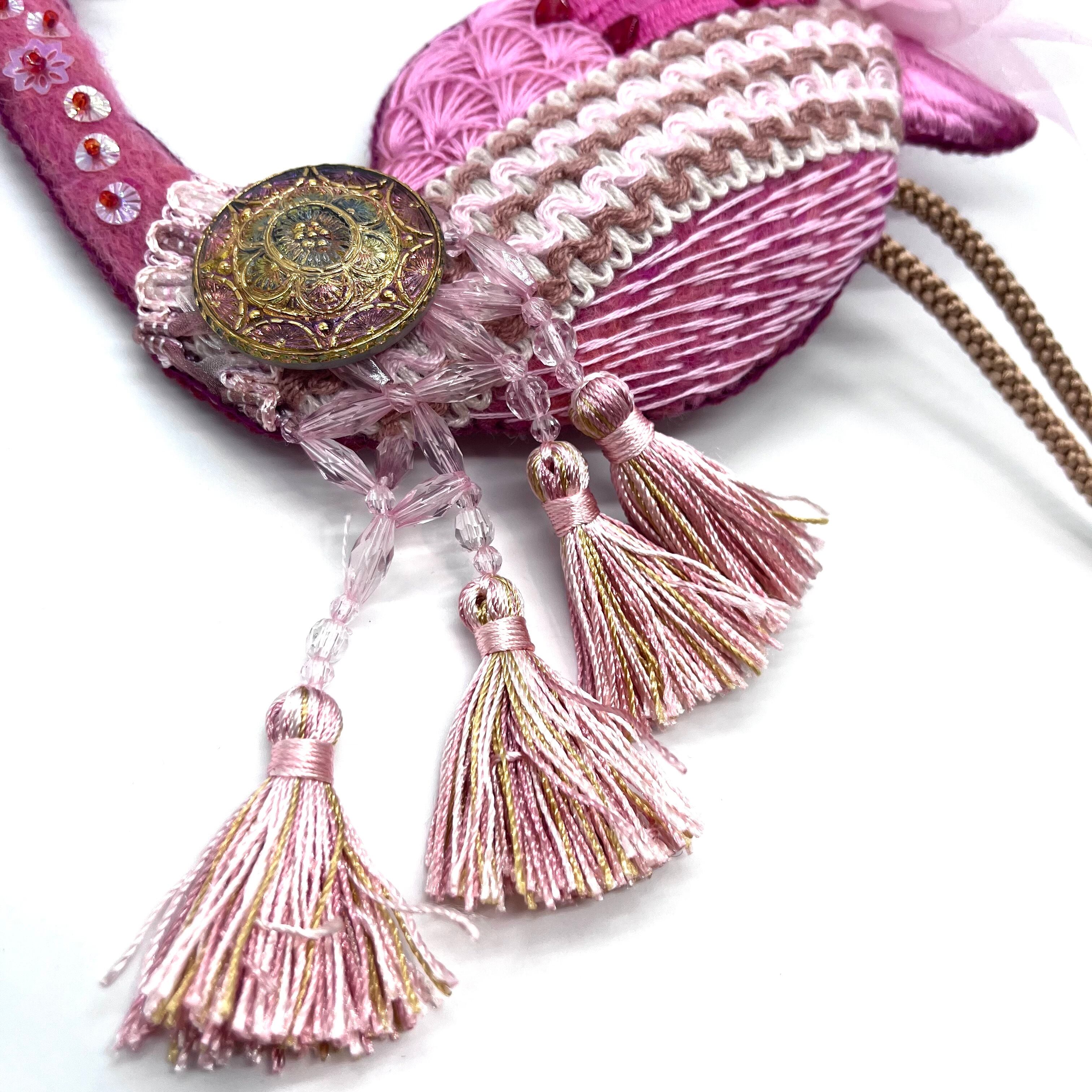 リボンやタッセル、ブレード等を組み合わせてブローチを制作。