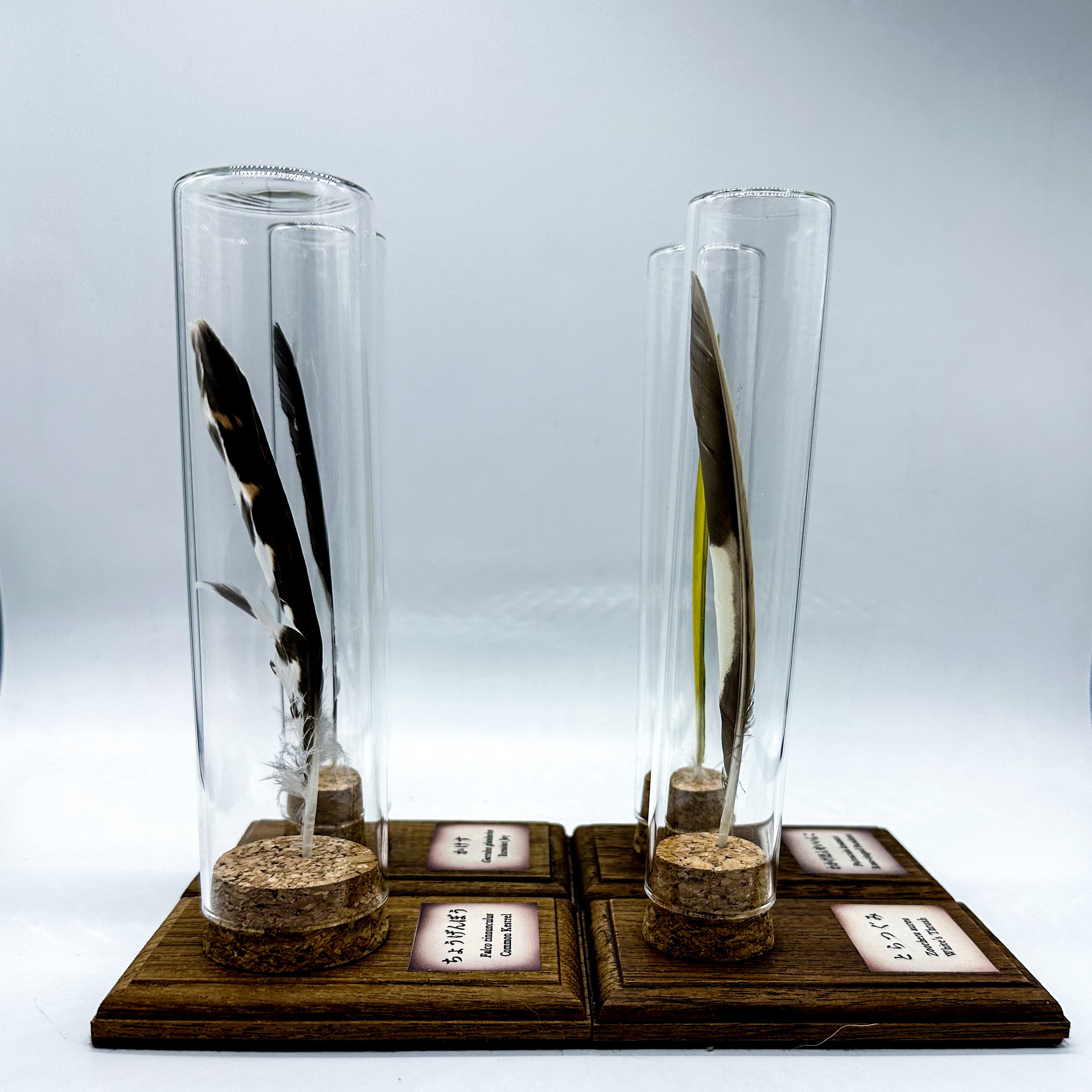 【野鳥生活】「標本風 羽根オブジェ・大」チョウゲンボウ・カケス・トラツグミ・ワカケホンセイインコ