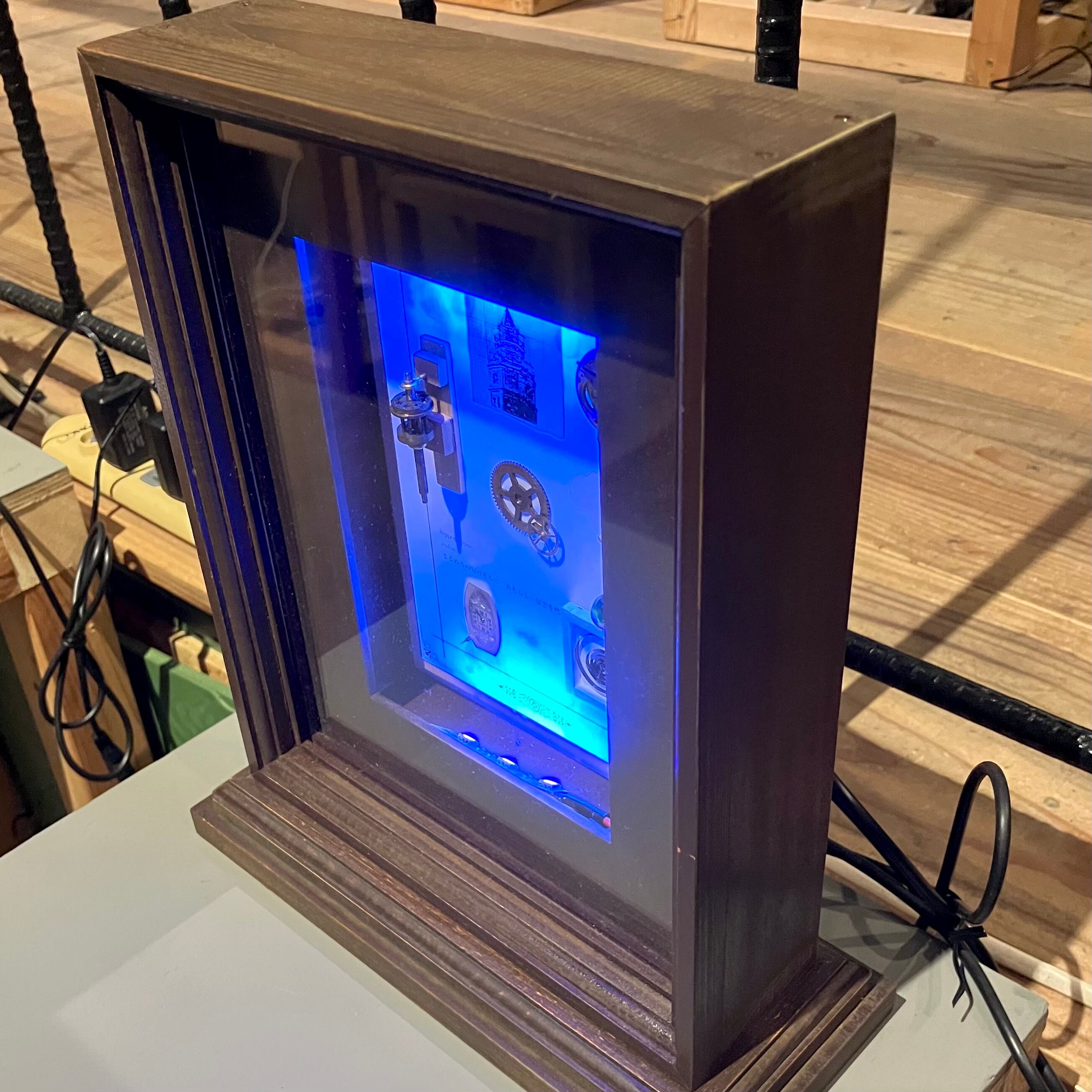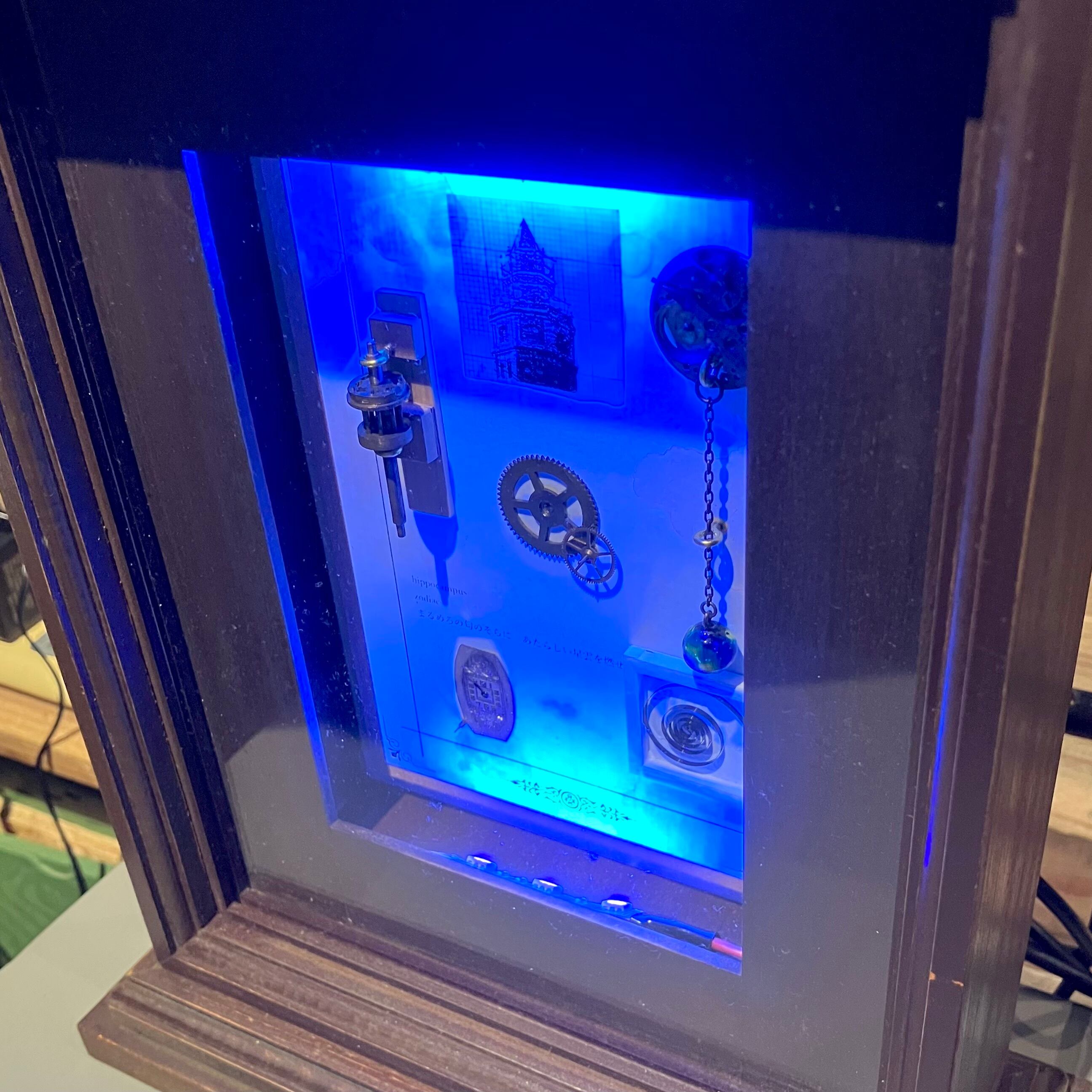 小さな木箱に入ったゼンマイ、歯車、鎖で下げられた