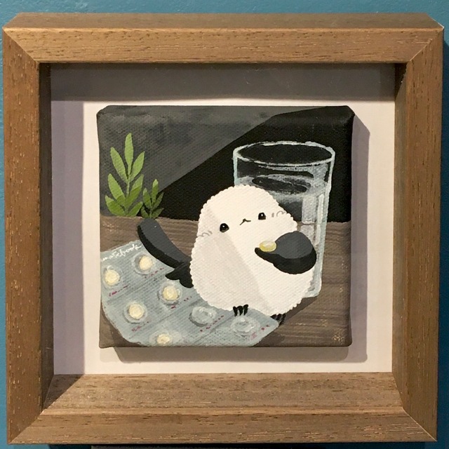 今回は黒い下地に初挑戦。絵の具の重なりから透けて見える黒が、画面に深みを与え、シマエナガの存在感を際立たせてくれます。